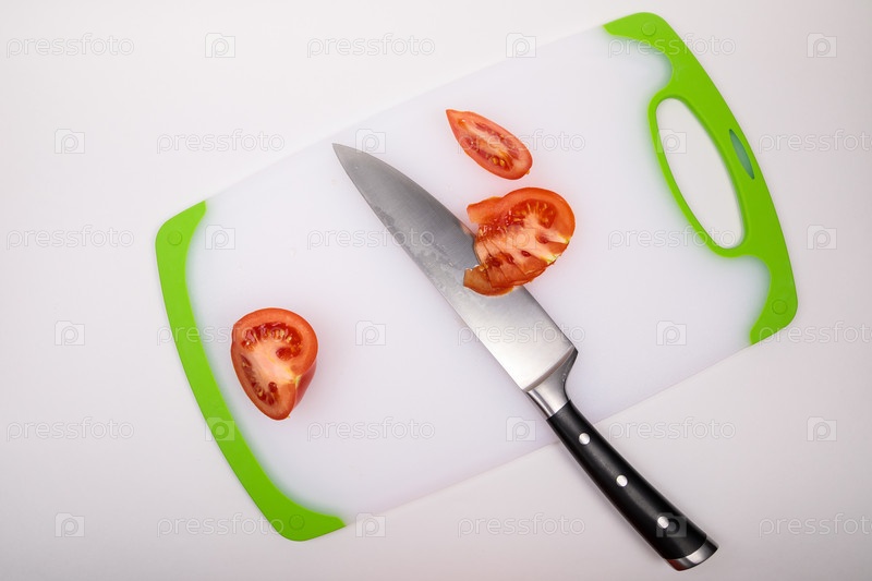 На разделочной доске свежий красный помидор и большой нож шеф-повара