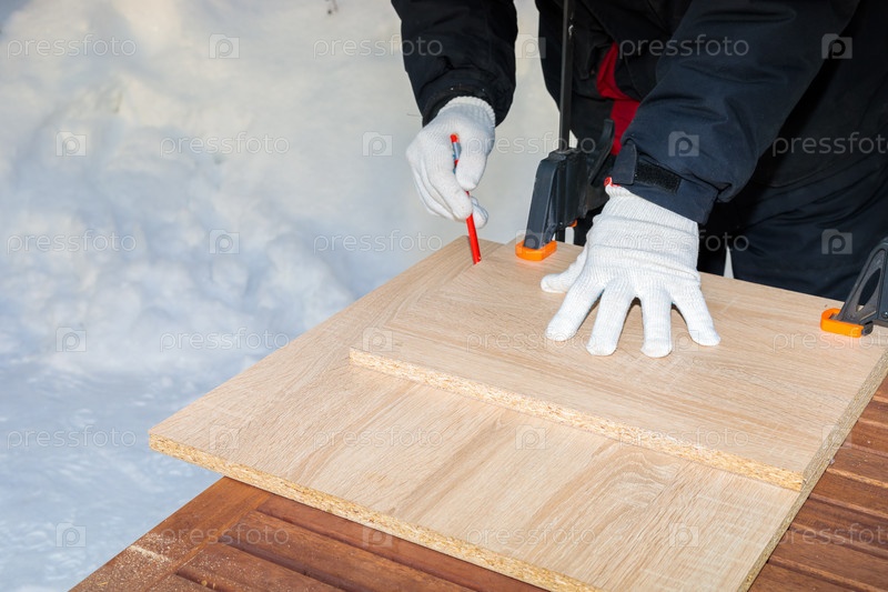 Мужчина, рабочий рисует карандашом на доске ДСП