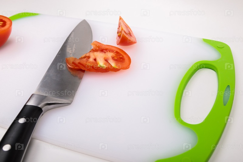 На разделочной доске свежий красный помидор и большой нож шеф-повара
