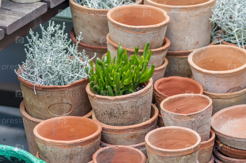 Много глиняных цветочных горшков - пустых и с растениями на деревянной полке