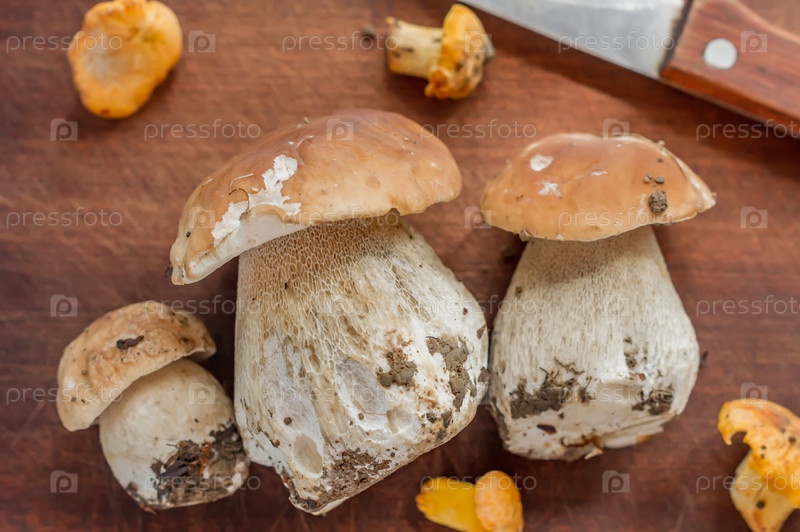 Лисички и белые грибы на деревянном столе