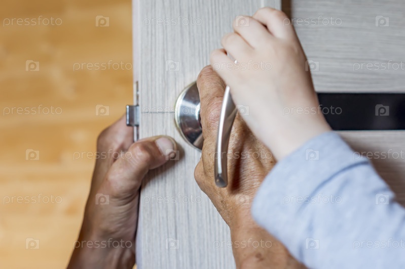 Маленький мальчик помогает отцу починить дверную ручку. крупный план мужских и детских рук, устанавливающих новый дверной шкафчик