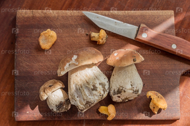 Лисички и белые грибы на деревянном столе