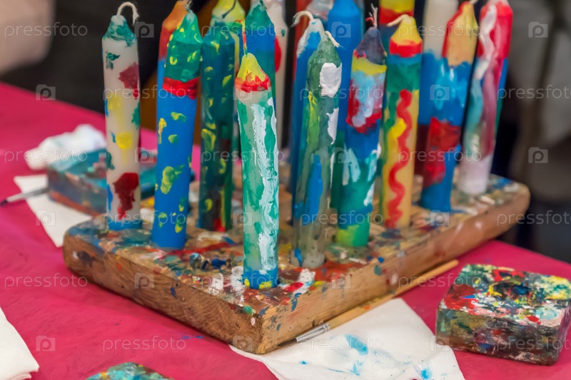 Разноцветные свечи с ручной росписью на столе