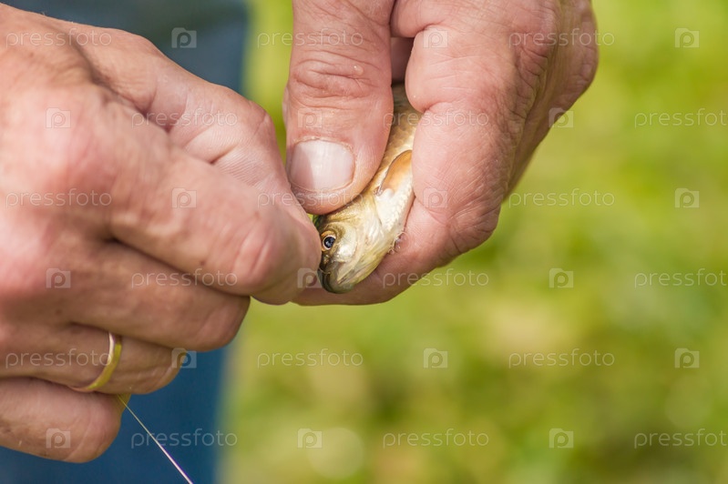 Рыбак вытаскивает крючок из карася