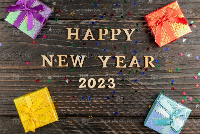Разноцветные подарочные коробки с завязанными бантиками. Новогодние подарки на деревянном столе с разбросанными звездами конфетти. Текст С Новым 2023 годом. Праздничная открытка. Плоская укладка