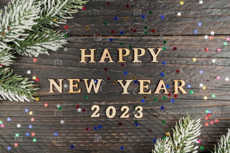 Концепция нового года. Счастливый новый год 2023 деревянный текст на деревянном фоне, еловая ветка на краю кадра
