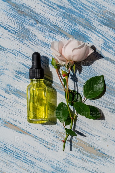 Стеклянная бутылка-капельница с цветком розы. Масло гиалуроновой кислоты, сыворотка с коллагеном и пептидами, средство по уходу за кожей. Макет упаковки, брендинг косметического дизайна
