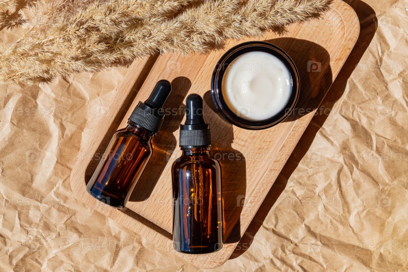 Упаковка косметики. Набор различных косметических бутылок крема или сыворотки на деревянном подносе. Пустая упаковка. Концепция продукта спа-салона природной красоты. Красота. Макет