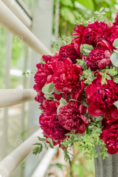 Свежие яркие цветущие пионы в старинной вазе