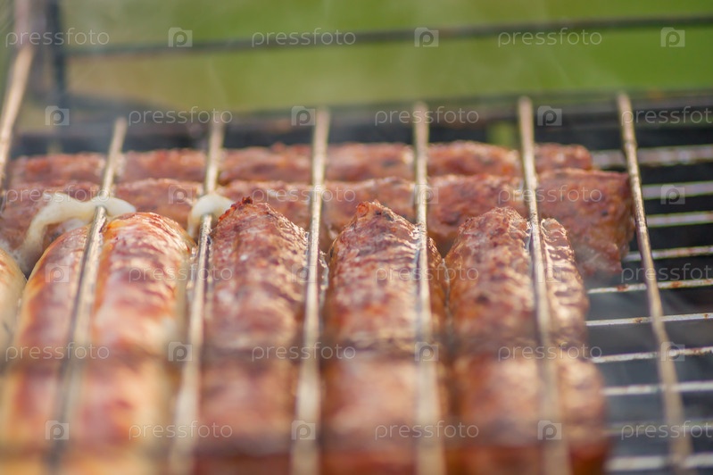 Сосиски барбекю на открытом воздухе, выборочный фокус