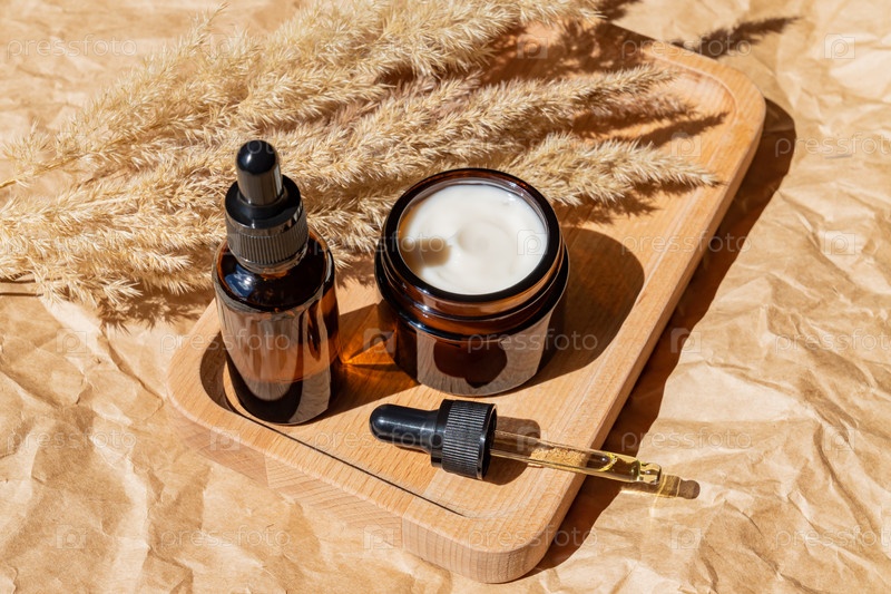 Пустая бутылка эфирного масла из янтарного стекла с пипеткой и коллагеновым кремом для лица на бежевом фоне украшена сухими дикими тростниками. Концепция ухода за кожей с натуральной косметикой