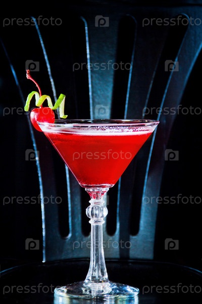 Коктейль из красного напитка с вишней в бокале для мартини, вишней и цедрой лайма