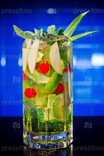 Коктейль из зеленого напитка с яблоком, лаймом и вишней в большой банке для большой компании на синем фоне