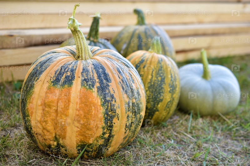 Желто-зеленая тыква в саду осенью