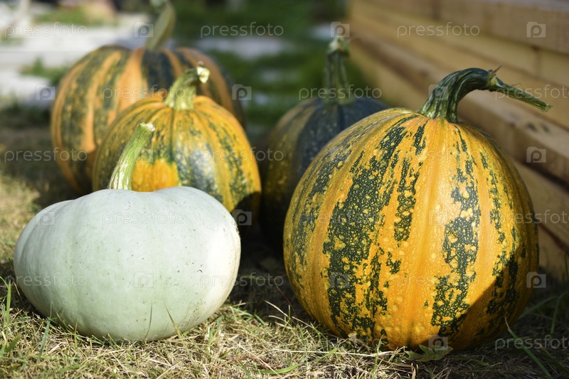 Желто-зеленая тыква в саду осенью