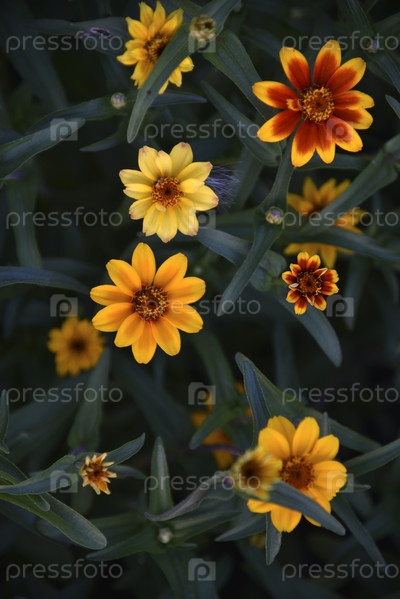 Маленькие цветы циннии узколистной на кусте в саду. Желтые цветы цинии летом