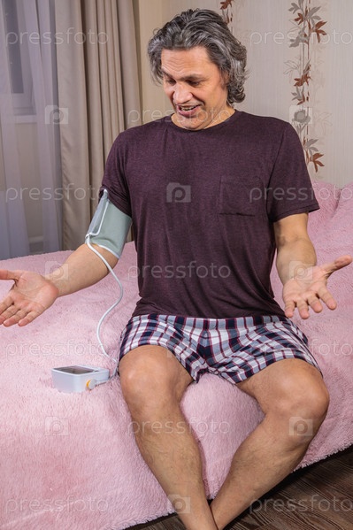 Мужчина 50 лет измеряет артериальное давление тонометром