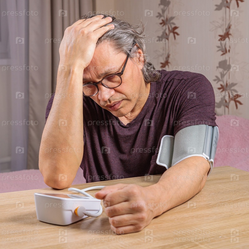 Мужчина 50 лет измеряет артериальное давление тонометром