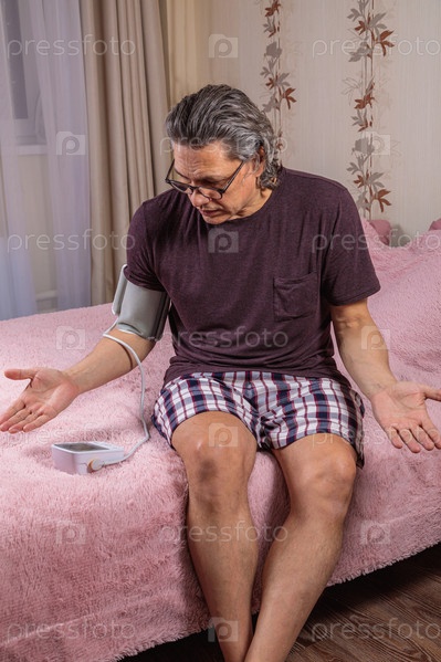 Мужчина 50 лет измеряет артериальное давление тонометром
