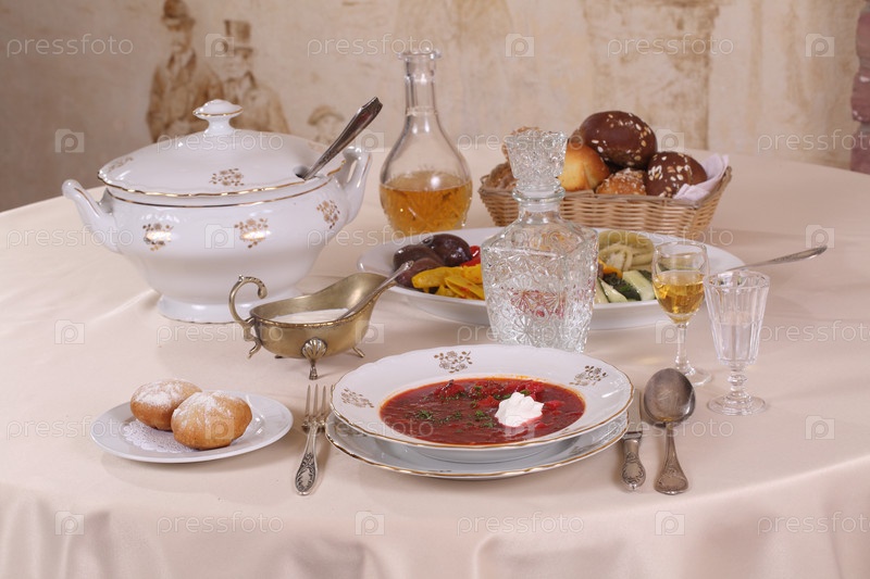 Борщ со сметаной,чесноком и острым перцем на деревянном столе