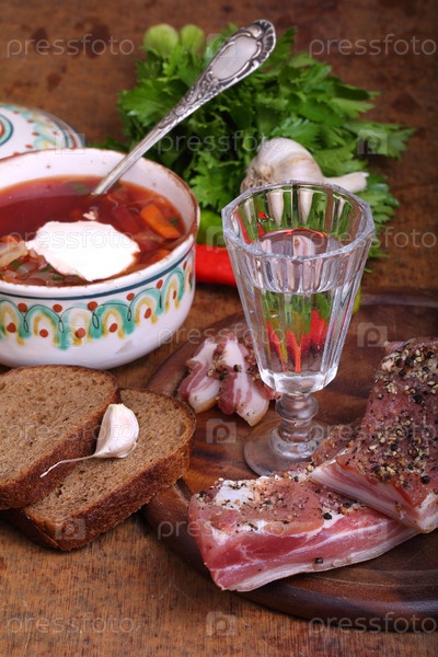 Борщ со сметаной,чесноком и острым перцем на деревянном столе