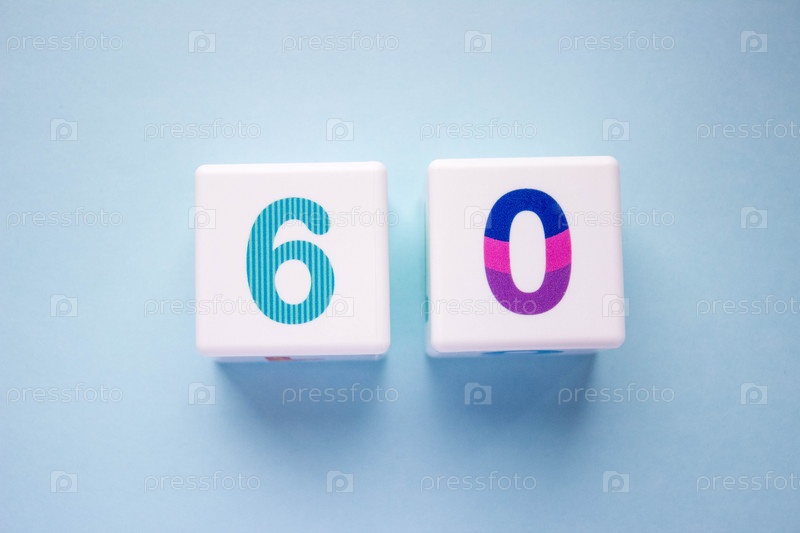 Крупный план белых пластиковых кубиков с красочным числом 60 на синем фоне. Объект в центре фотографии