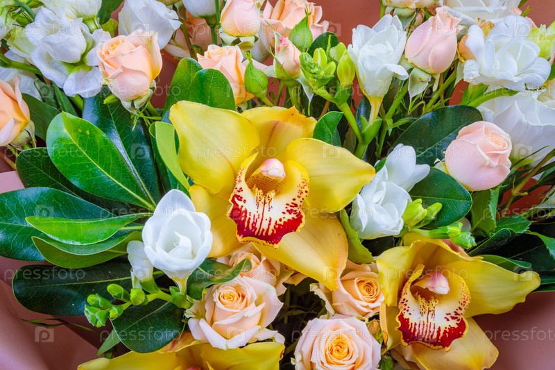 Свежий букет в пастельных тонах розового, белого, зеленого, желтого