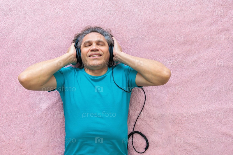 50-летний мужчина слушает музыку в наушниках дома, лежа на кровати