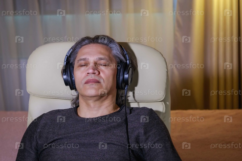 50-летний мужчина слушает музыку в наушниках дома, сидя в кресле