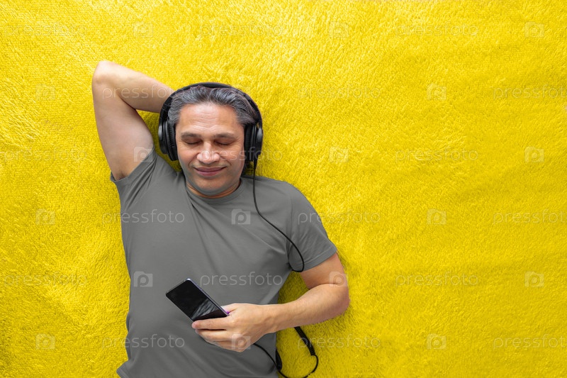 50-летний мужчина слушает музыку в наушниках дома, лежа на кровати
