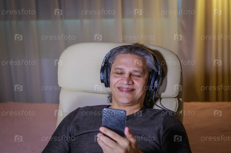 50-летний мужчина слушает музыку в наушниках дома, сидя в кресле