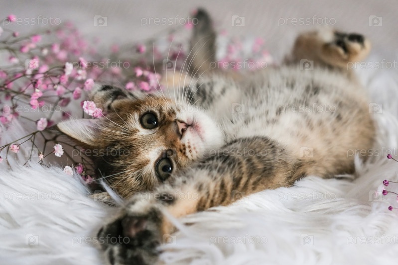 Симпатичный шотландский прямоухий котенок и розовые цветы на белом одеяле