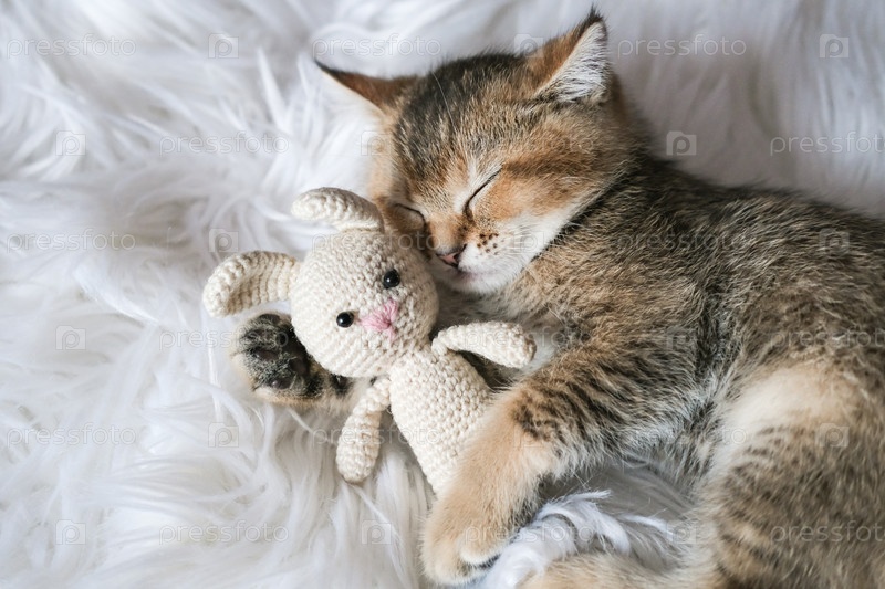 Милый котенок спит на пушистом одеяле, обнимая вязаного игрушечного кролика