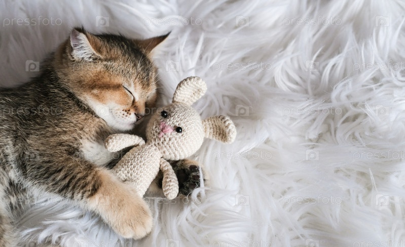 Милый котенок спит на пушистом одеяле, обнимая вязаного игрушечного кролика. Веб-баннер с копией пространства. Место для текста