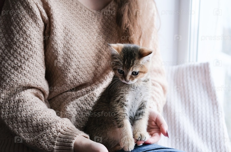 Милый котенок сидит на коленях у хозяйки