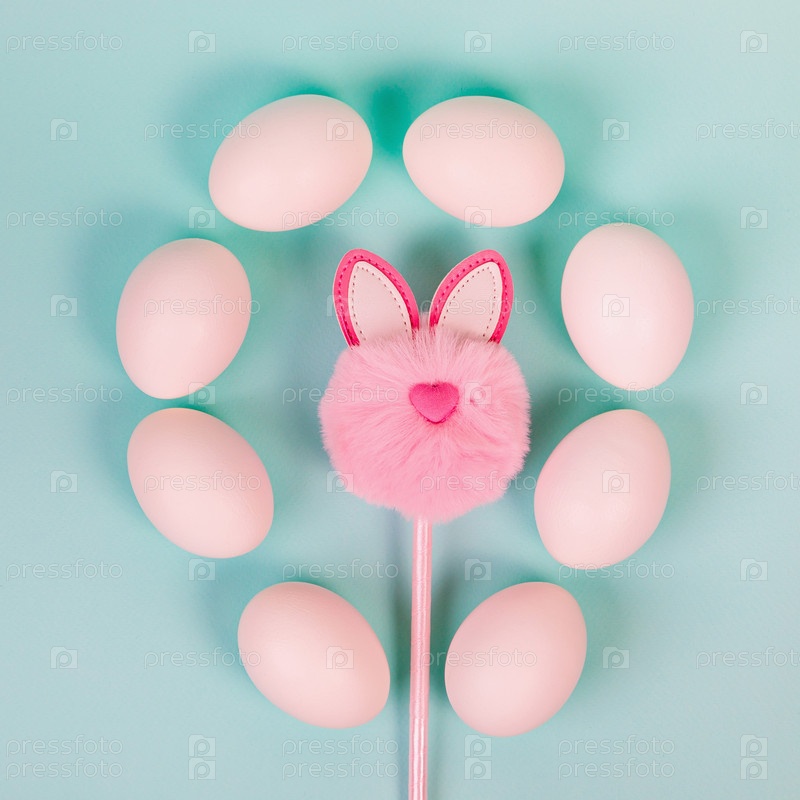Пасхальный. Белые яйца с искусственным кроликом на однородном голубом фоне