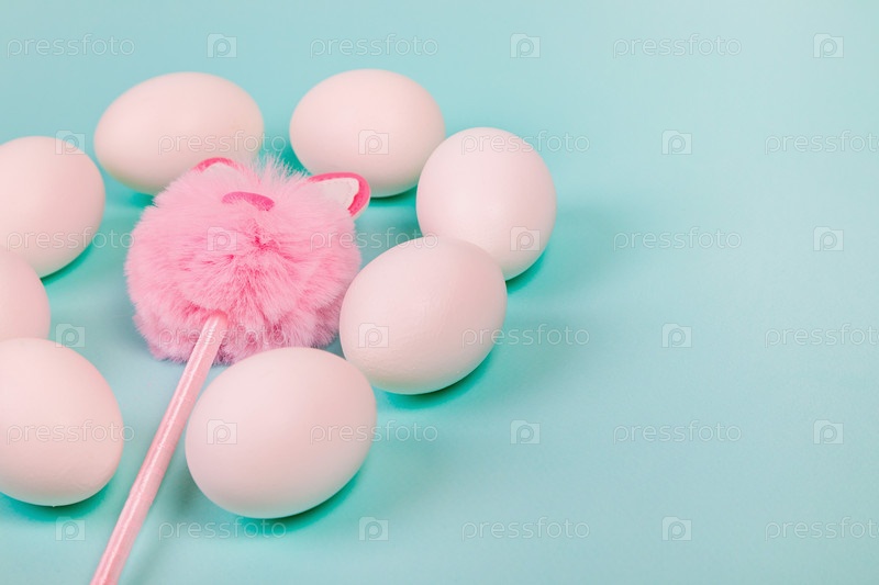 Пасхальный. Белые яйца с искусственным кроликом на однородном голубом фоне