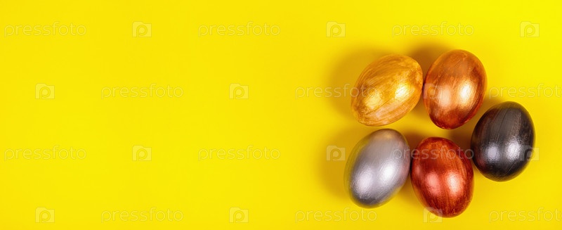 Разноцветные яйца на однородном желтом фоне с местом для текста
