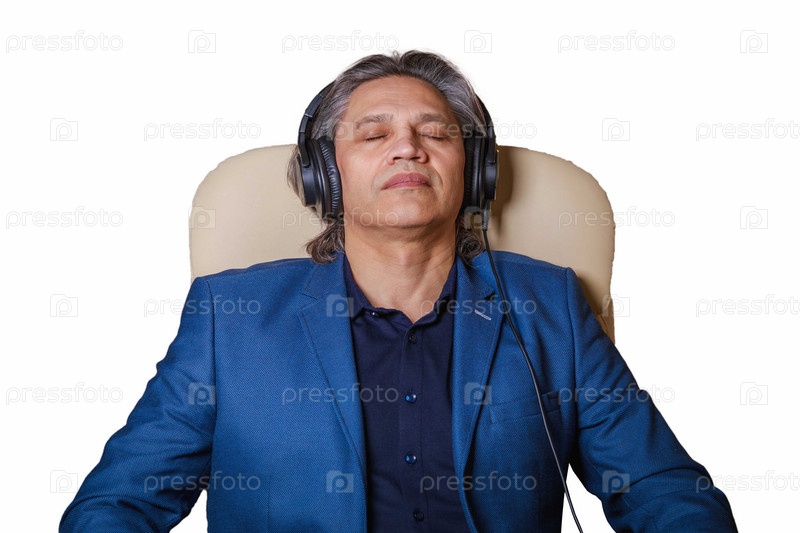 50-летний мужчина слушает музыку в наушниках дома, сидя в кресле