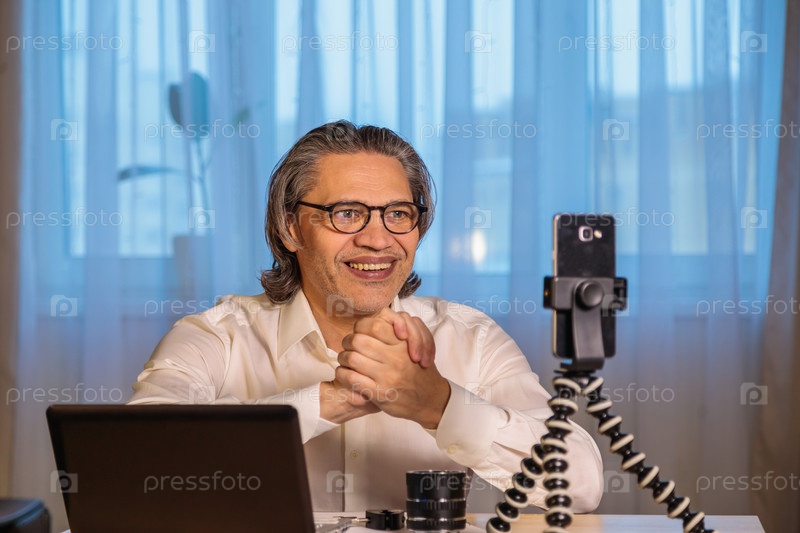 50-летний блогер в очках записывает видео из дома на свой смартфон