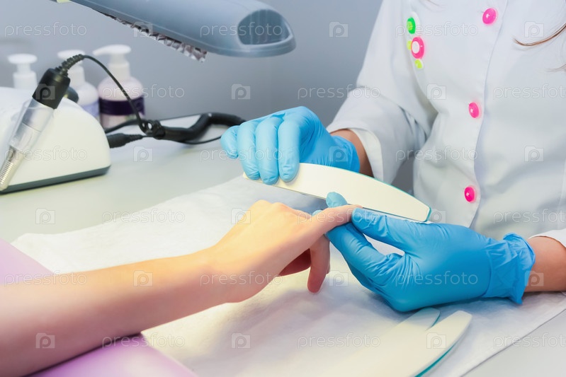 В салоне красоты женщине делают маникюр с помощью пилочки для ногтей