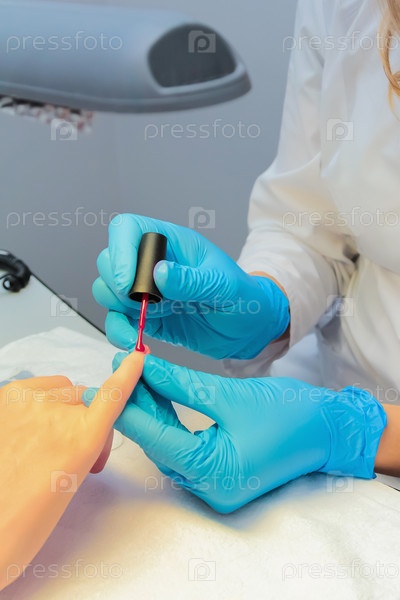 В салоне красоты женщине делают маникюр, красят ноготь лаком