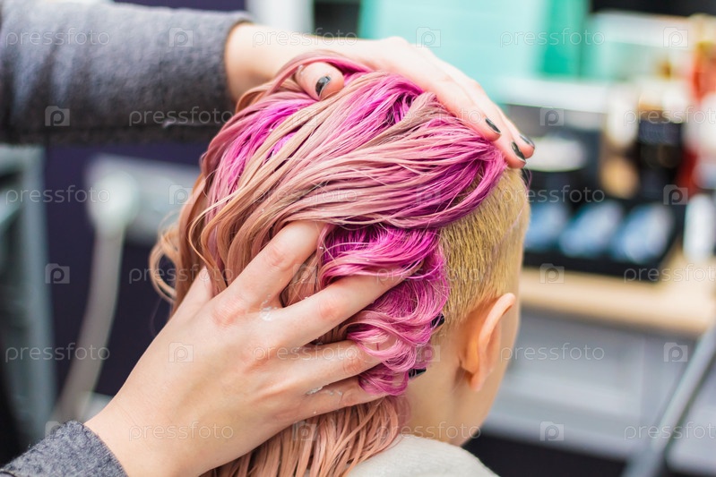 Окрашивание волос для девушки в салоне красоты, длинные волосы розовые