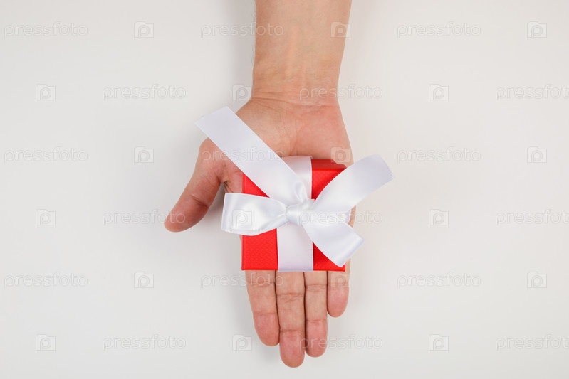 Подарочная коробка в мужских руках на праздник. Вид сверху