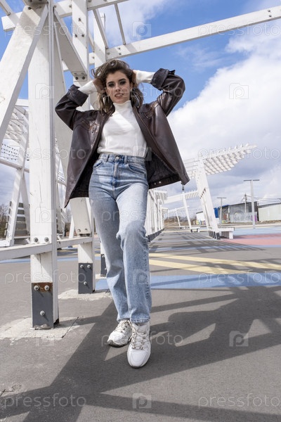Красивая молодая девушка с вечерним макияжем, позирует среди деревянных конструкций
