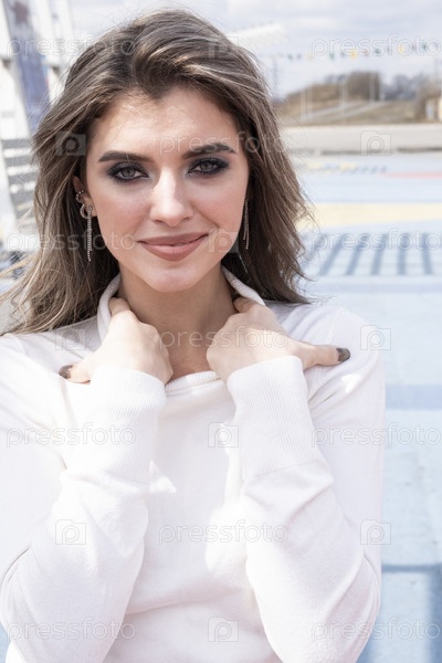 Красивая молодая девушка с вечерним макияжем, позирует среди деревянных конструкций