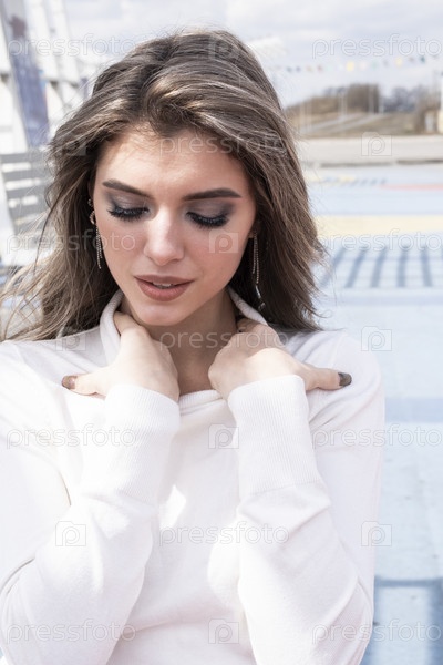 Красивая молодая девушка с вечерним макияжем, позирует среди деревянных конструкций