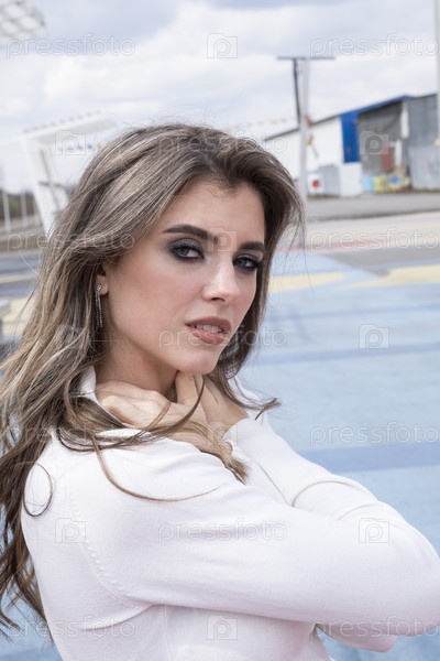 Красивая молодая девушка с вечерним макияжем, позирует среди деревянных конструкций