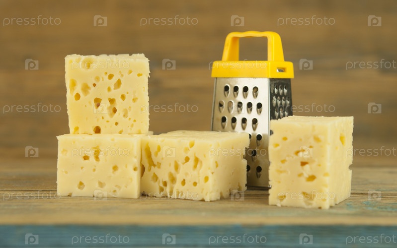 Кубики сыра с миниатюрной теркой на деревянном кухонном столе
